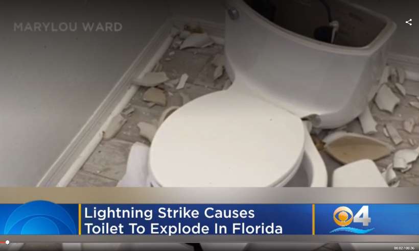 O vaso sanitário explodiu em centenas de pedaços na mesma hora em que a reação em cadeia fez a energia de um raio, que atingiu a caixa de esgoto, viajar pela tubulação até o banheiro de uma residência na Flórida, nos Estados Unidos.