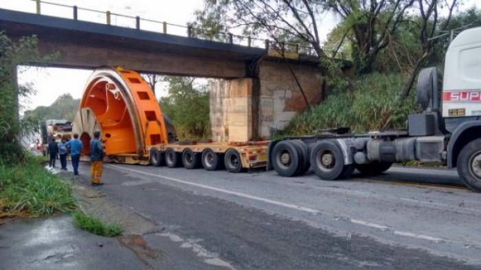 Carga alta fica presa no viaduto da BR-354 em Arcos