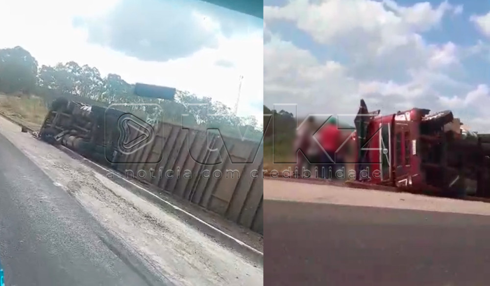 VÍDEO: Carreta transportando gado tomba na BR-262 em Campos Altos/MG
