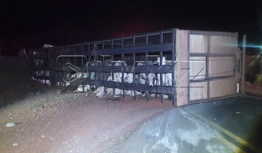 VÍDEO: Carreta transportando gado tomba e interdita BR-262 em Campos Altos/MG
