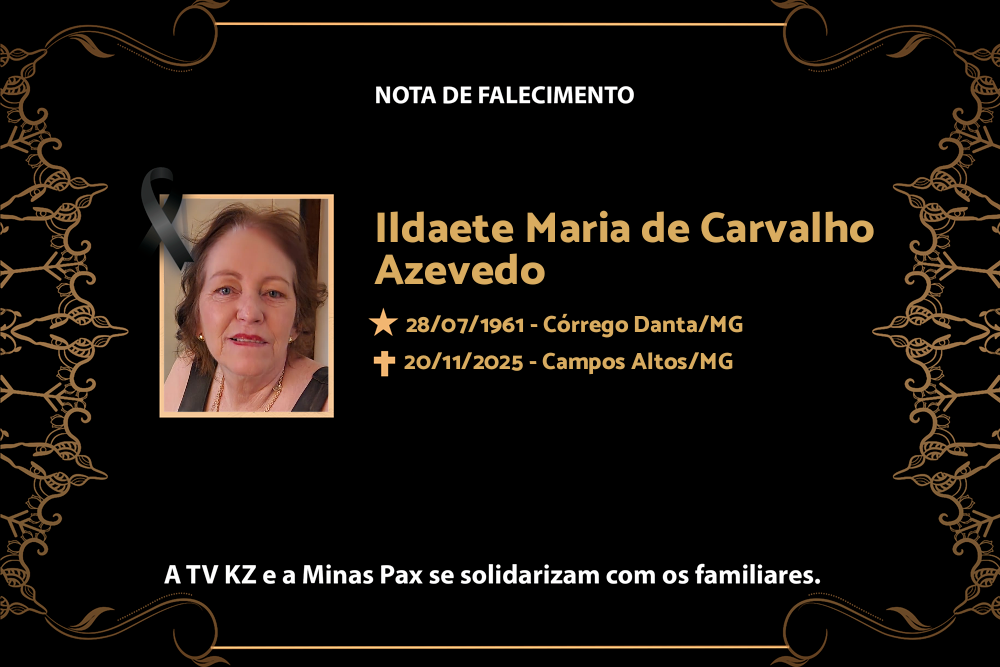 É com pesar que Anizio (marido) e família comunicam o falecimento de Ildaete Maria de Carvalho Azevedo, aos 64 anos, ocorrido nesta quinta-feira, 20 de novembro de 2025, em Campos Altos/MG.
