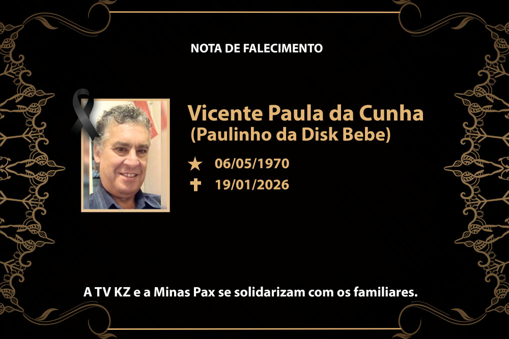 É com pesar que Karlene, Reginaldo e irmãos comunicam o falecimento de Vicente Paula da Cunha, aos 55 anos, conhecido como Paulinho da Disk Bebe, ocorrido nessa segunda-feira, 19 de janeiro de 2026, em Contagem/MG.