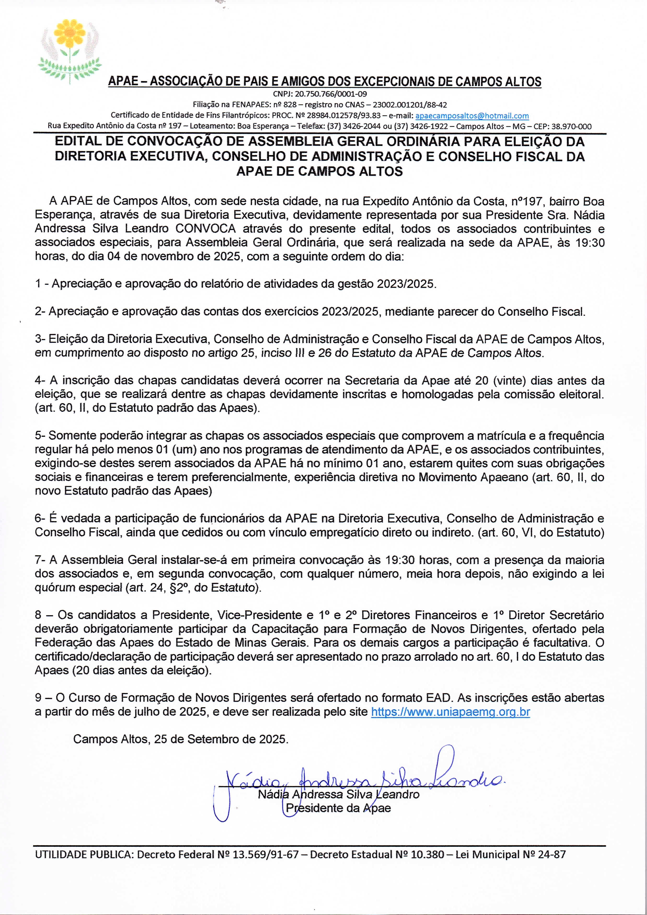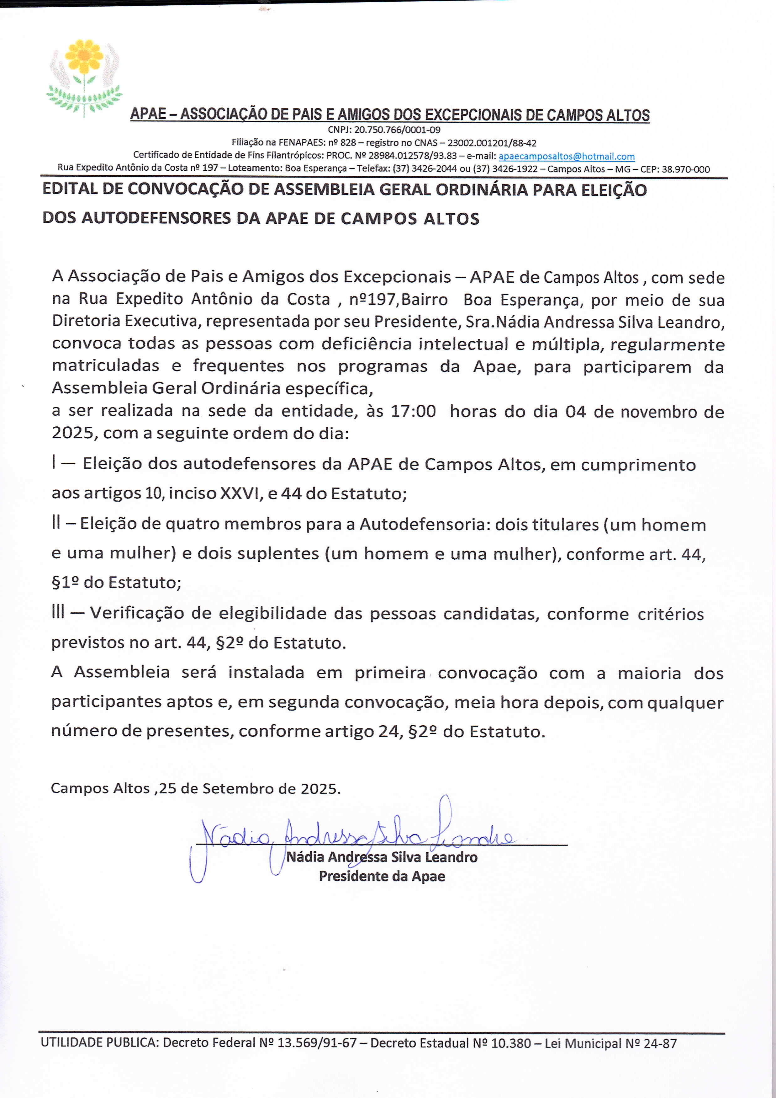 A Associação de Pais e Amigos dos Excepcionais (APAE) de Campos Altos/MG publicou editais convocando seus associados e usuários para duas assembleias gerais ordinárias, marcadas para a terça-feira (4), 4 de novembro de 2025, na sede da entidade.