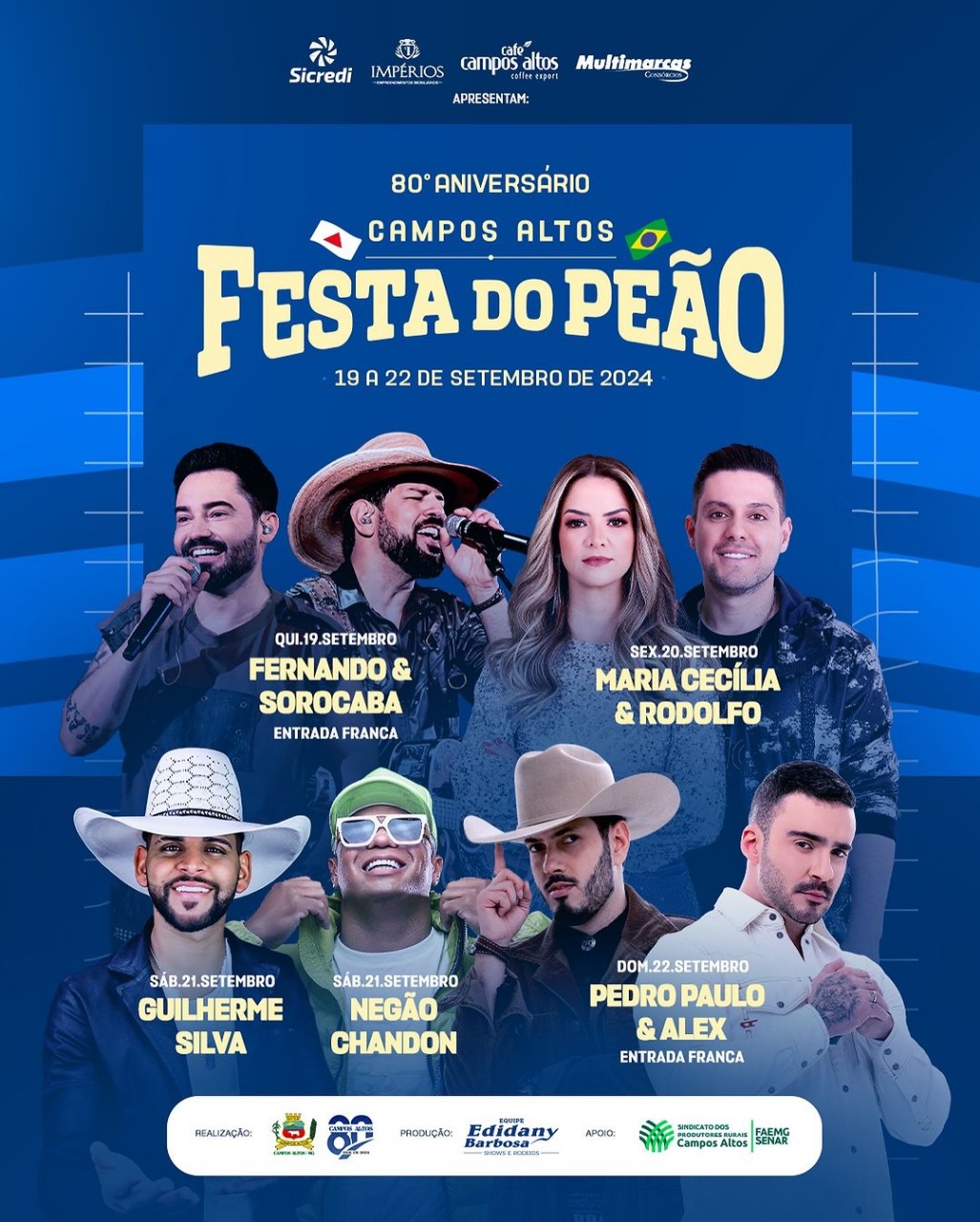 A organização está a cargo da Equipe Edidany Barbosa Shows e Rodeio e tem o patrocínio oficial da Sicredi, Impérios Empreendimentos Imobiliários, Café Campos Altos e Multimarcas Consórcios.