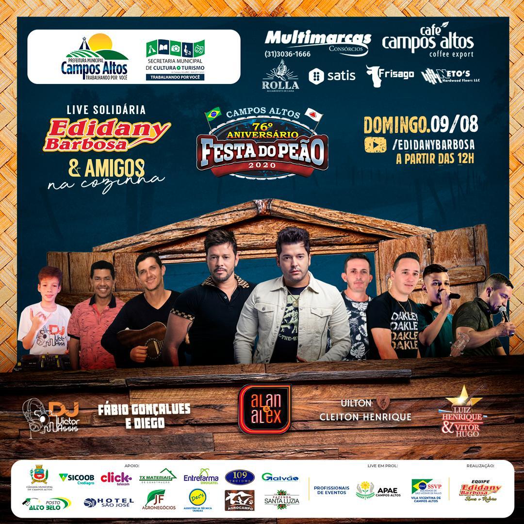 O evento será realizado pela Prefeitura Municipal, através da Secretaria Municipal de Cultura e Turismo, em parceria com a equipe Edidany Barbosa Rodeio Show. A “Live Solidária - Festa do Peão de Campos Altos 2020” acontece neste domingo, dia 9 de agosto a partir das 12h.