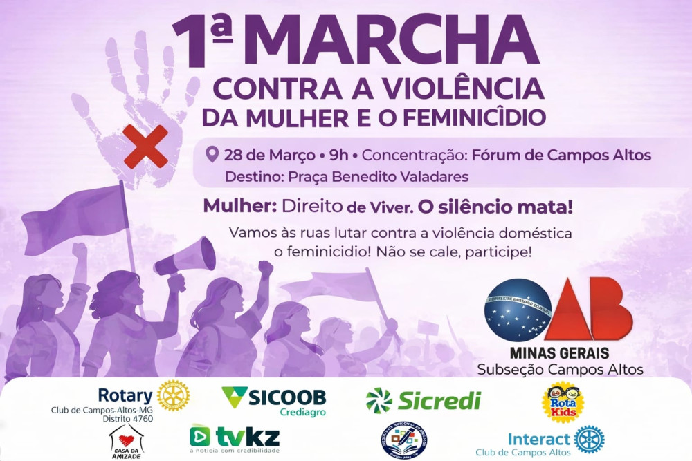 A Marcha contra a Violência da Mulher e Feminicídio será realizada no dia 28 de março, em Campos Altos/MG, como um ato de conscientização, cobrança e união diante de casos recentes que geraram comoção no município. A mobilização sairá do fórum e seguirá até a praça central da cidade com o lema “Mulher Direito de Viver”.