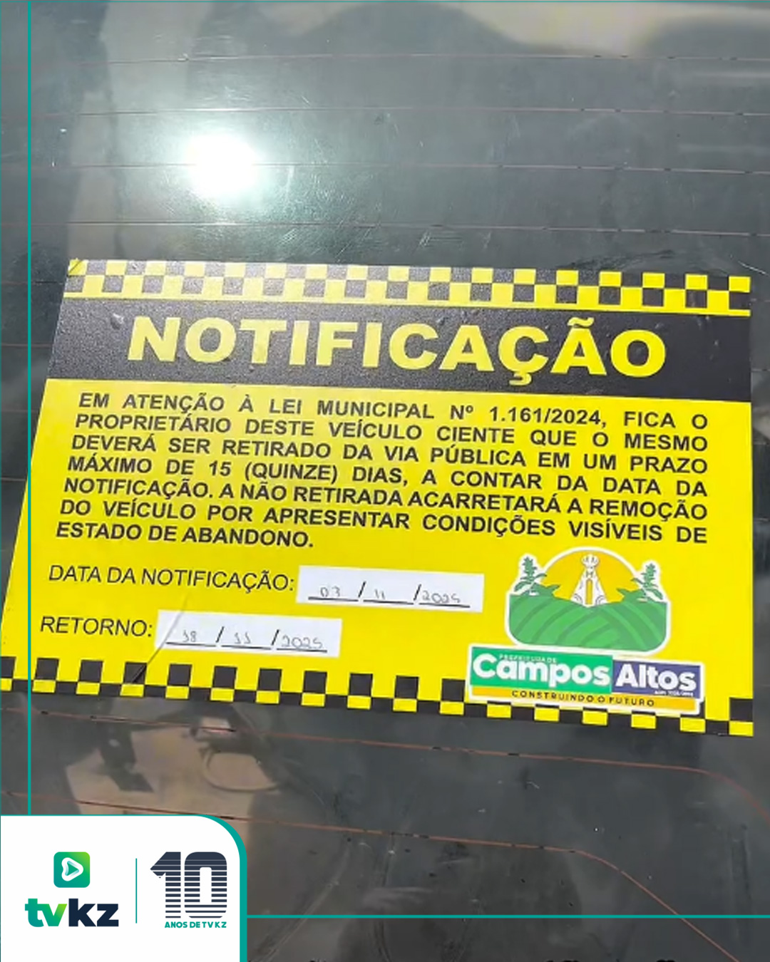 De acordo com a Prefeitura, está sendo realizada uma ação de notificação baseada na Lei Municipal 1.161/2024, na qual um aviso é fixado no veículo, e o proprietário tem um prazo para retirá-lo da rua. Caso o prazo não seja cumprido, o veículo será removido pela Polícia Militar e encaminhado a um pátio credenciado.