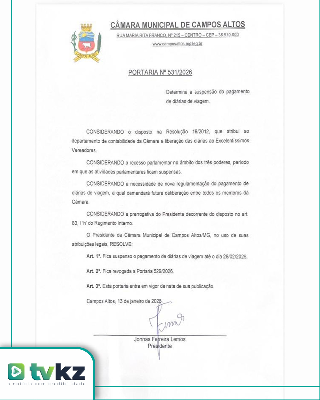O presidente da Câmara Municipal de Campos Altos/MG, Jonnas Ferreira Lemos, que assumiu a presidência em 2026, editou duas portarias que mantêm a suspensão temporária das nomeações de assessores parlamentares e do pagamento de diárias de viagem aos vereadores, medidas que já vinham sendo adotadas anteriormente pela Casa.