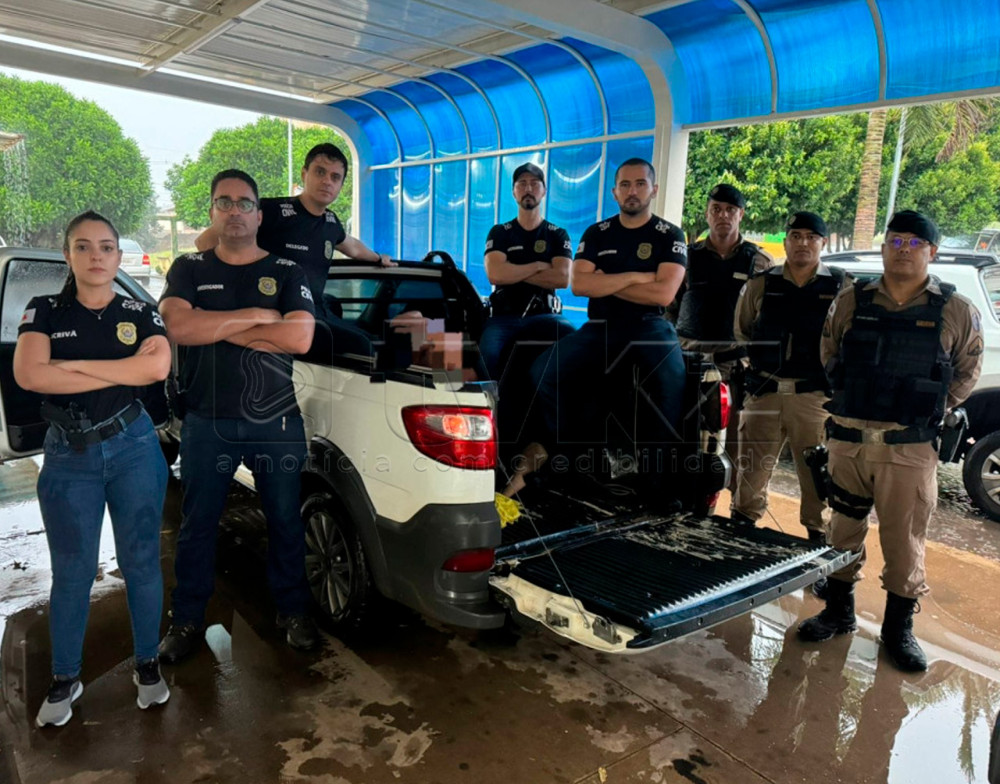 Policiais civis e militares que participaram da captura do suspeito, que se encontra preso dentro da caminhonete.