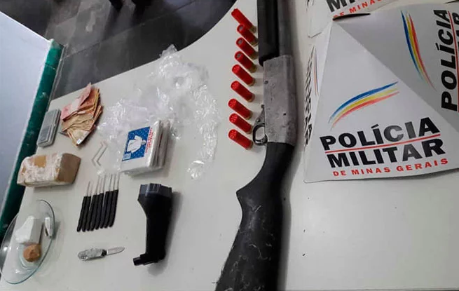 Foram apreendidos 1 espingarda cal. 12 e 9 cartuchos cal. 12 (01 deflagrado); 1 quite de chave micha; 1 barra de maconha; 1 pedra grande de crack; 1 porção grande de cocaína; 1 balança de precisão e R$1020,00 reais em dinheiro.