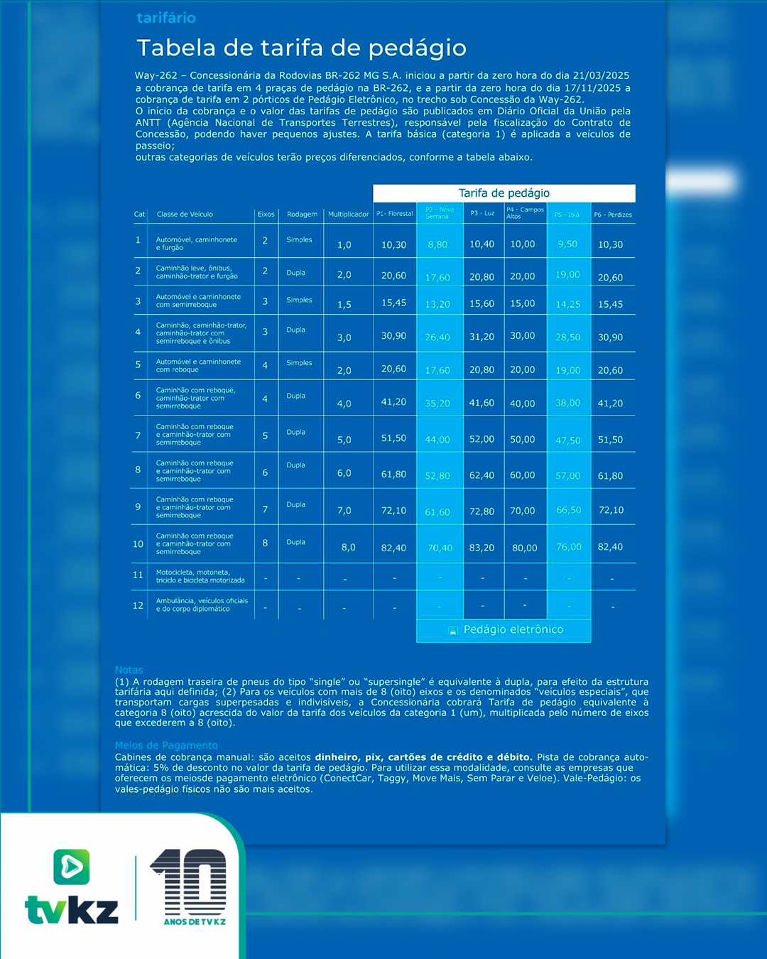A cobrança das tarifas nos novos pedágios da BR-262, ambos operados pela Way-262, concessionária responsável pelo trecho entre Uberaba/MG e Betim/MG, conforme contrato iniciado em 2025, começou à meia-noite desta segunda-feira (17). Os dois novos pedágios eletrônicos estão instalados em Ibiá/MG e Nova Serrana/MG, somando-se aos quatro já existentes e totalizando seis pontos de cobrança no corredor. A nova concessão prevê a duplicação de apenas 44 quilômetros da BR-262 — que será entre Bom Despacho/MG e Nova Serrana/MG — e todo o restante do trecho não será contemplado com obras de duplicação.